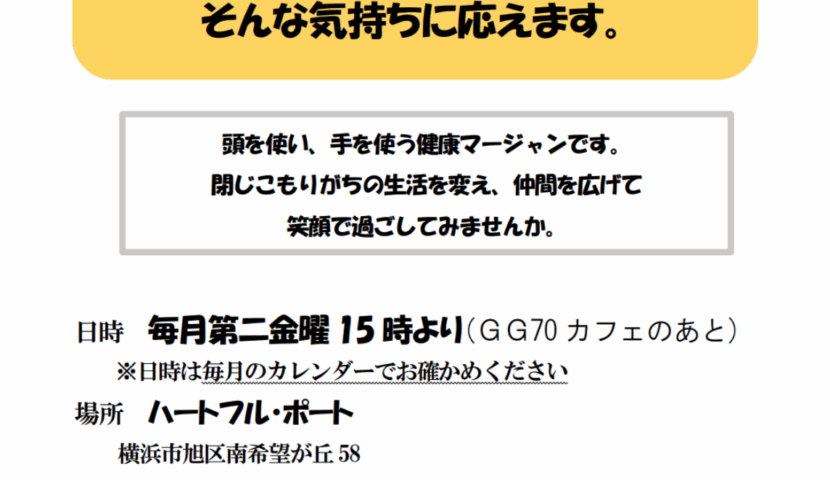 イベント はじめての麻雀 2026.03.28 2026.04.28 Post Share Hatena Pocket RSS feedly Pin it 記事のタイトルとURLをコピーする Post Share Hatena Pocket RSS feedly Pin it ハートフルポート地域交流麻雀 昼下がりのBarコハクノオト 前の記事 GG70カフェ 次の記事