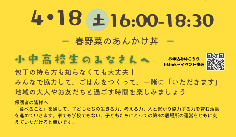 イベント 作って食べようー春野菜のあんかけ丼ー 2026.04.01 2026.04.28 Post Share Hatena Pocket RSS feedly Pin it 記事のタイトルとURLをコピーする Post Share Hatena Pocket RSS feedly Pin it soil、イベント、チャレンジ、つながる、ハートフルポート、地域交流、子どもの居場所、希望が丘、希望ヶ丘ハートフルポート さんさんレインボー主催 温熱のお話会&体験交流会 前の記事 旬菜カフェ 次の記事